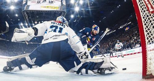 Mit einem sicheren Vorsprung gelingt alles: Hier arbeitet Tobias Rieder den Puck am Ingolstädter Goalie Davin Williams zum 5:2 vorbei. © Red Bull/City-Press