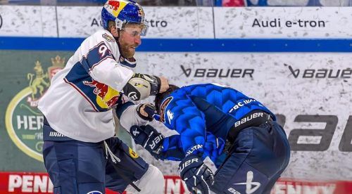 Der Strafzeitensammler: Bei Dillon Heatherington (hier gegen Morgan Ellis) kamen 41 Minuten in die Bilanz. © IMAGO/Fotostand/Schäfer