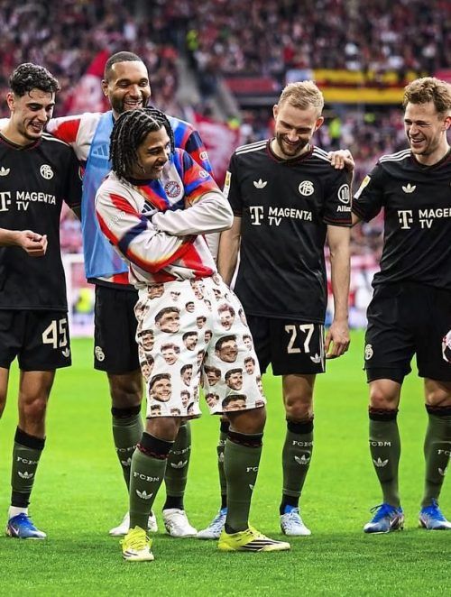 Was war da denn los? Serge Gnabry schlüpfte nach dem 3:2 in Freiburg plötzlich in eine spezielle Hose, die Doppeltorschütze Tom Bischof ihm gebracht hatte. Darauf zu sehen: das Gesicht von Teamkollege Leon Goretzka – und zwar in mehrfacher Ausführung. Josip Stanisic hielt zudem ein großes Poster in