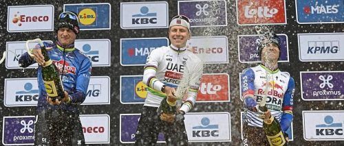Gewohntes Bild: Tadej Pogacar bejubelt seinen Sieg, Mathieu van der Poel (l.) und Flandern-Debütant Remc