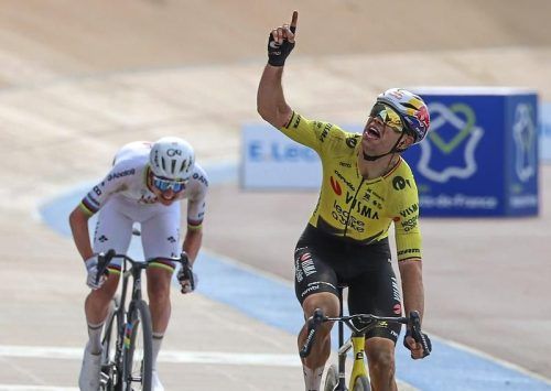 „Das bedeutet mir alles, es war mein großes Ziel seit meinem ersten Start 2018“, sagt Wout van Aert. Im Hintergrund muss sich Tadej Pogacar geschlagen geben. © CHIB
