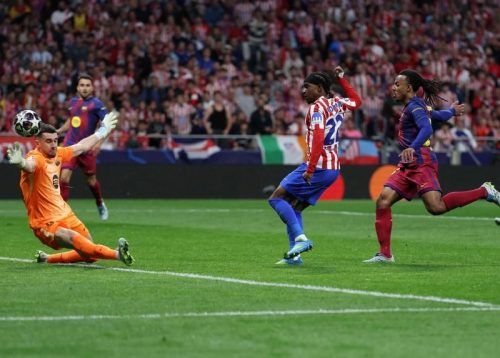 Goldtorschütze der Madrilenen: Der Ex-Leipziger Ademola Lookman (Mitte) erzielte das wichtige 1:2 für Atlético gegen den FC Barcelona. © Coex/AFP
