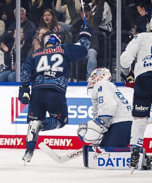Wenn die Scheibe einfach mal reingeht: Yasin Ehliz kann Adler-Goalie Maximilian Franzreb zum 2:1 überwinden. © Red Bull/City-Press