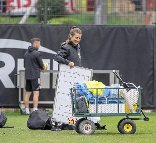 Ein bisschen Spaß muss sein: Eta macht die Arbeit auf dem Platz Freude, wie man sieht. © IMAGO