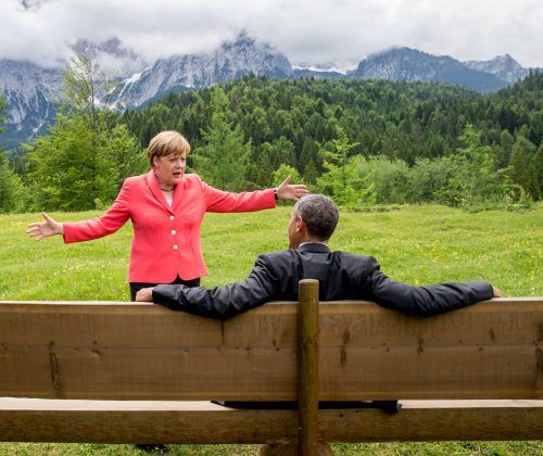 Es gibt Fotos, die zu Symbolbildern für politische Veranstaltungen werden und mächtiger wirken können als jede inhaltliche Abmachung. Das Bild vom G7-Gipfel im bayerischen Elmau aus dem Jahr 2015 war so eines. Da steht Kanzlerin Angela Merkel in hellrotem Blazer