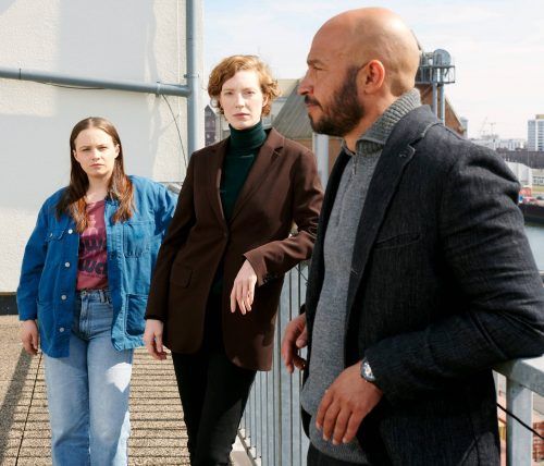 Im Hafen wird die Leiche eines Arztes gefunden. Liv Moormann, Linda Selb und Mads Andersen (Jasna Fritzi Bauer, Luise Wolfram und Dar Salim, v. li.) finden heraus, dass der Tote sozial Schwache kostenlos behandelt hat. Warum musste ausgerechnet er sterben? „Und immer gewinnt die Nacht“ lautet der po