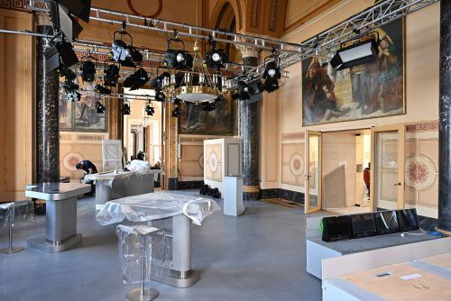München – Von der „Seeschlacht bei Salamis“ ist kaum noch etwas zu sehen – das riesige 5,60 mal 9,80 Meter große Gemälde von Wilhelm von Kaulbach im Senatssaal des Landtags versinkt hinter moderner Technik und Stahlkonstruktionen. Der 300 Quadratmeter große Raum verwandelt sich