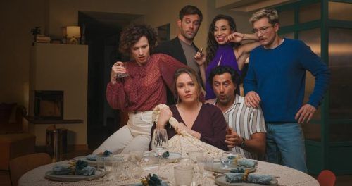 Was noch halbwegs harmonisch begann, endet im Streit: „Pärchenabend“ mit (v. li.) Adina Vetter, Alwara Höfels, Ken Duken, Serkan Kaya, Carol Schuler und Jakob Matschenz. © Luis Zeno Kuhn/ZDF