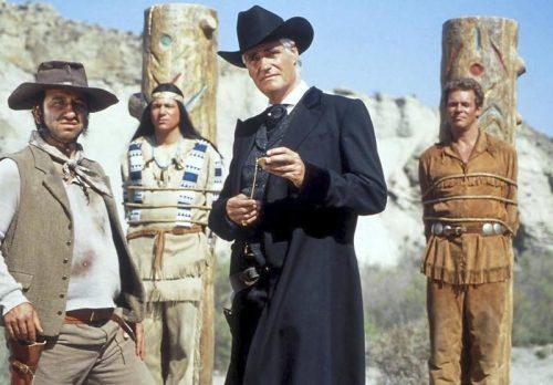 Kult: „Der Schuh des Manitu“ mit (v. li.) Rick Kavanian, Michael „Bully“ Herbig, Sky du Mont und Christian Tramitz. © ProSieben