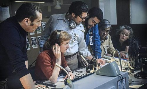 Und plötzlich werden aus Sportreportern politische Berichterstatter: Blick in die Kommandozentrale des US-Senders ABC, der über das Olympia-Attentat in München 1972 hautnah berichtete. Leonie Benesch (2. v. li.) spielt eine deutsche Übersetzerin. © Constantin
