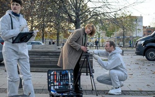 Woher kam der Schuss? Kriminaltechnikerin Nancy Bauer (Johanna Polley) und die Kommissare Susanne Bonard (Corinna Harfouch) und Robert Karow (Mark Waschke, v. li.) am Tatort. © RBB