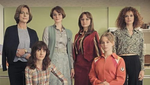 Stehen derzeit für „Ku‘Damm 77“ vor der Kamera: Claudia Michelsen, Marie Louise Albertine Becker, Maria Ehrich, Sonja Gerhardt, Carlotta Bähre und Emilia Schüle (v.li.). © Klein/ZDF