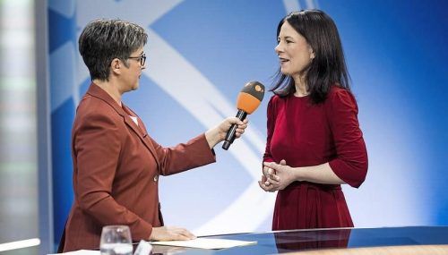 Shakuntala Banerjee vom ZDF im Gespräch mit Außenministerin Annalena Baerbock (Bündnis 90/Die Grünen). © Thomas Kierok