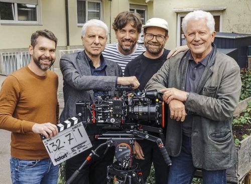 Die Kamera läuft: Udo Wachtveitl (2.v.li.) und Miroslav Nemec (re.) mit Produzent Korbinian Dufter (li.), Kameramann Michael Schreitel (Mi.) und Regisseur Sven Bohse. © Heiden/BR