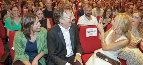 Ein Foto im Kinosaal: Gillian Anderson mit den Filmfest-Chefs Julia Weigl und Christoph Gröner. © Viviane Simon/API