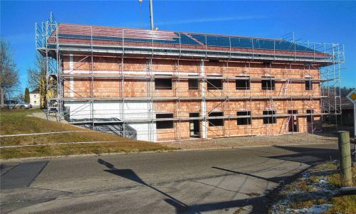 Ein neuer Blickfang für Aspertsham: In der Ortsmitte entsteht das markante Gemeinschaftshaus für Feuerwehr und Schützen.Fotos Anneliese Angermeier