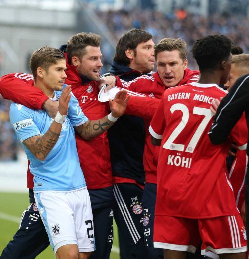 Der Regionalliga-Tabellenführer TSV 1860 hat im Münchner Derby gegen den FC Bayern II eine schmerzhafte 0:1-Niederlage bezogen. Den entscheidenden Treffer erzielte Fabian Benko (74.). Zwar gab es in der Partie einige hitzige Szenen – wie hier beim Platzverweis des Löwen Nicholas Helmbrecht (li.) –,