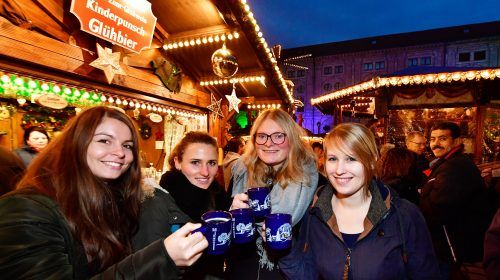 Die Saison ist eröffnet. Noch vor dem Dezember kommen weihnachtliche Gefühle auf. Nadine (v.l.), Alexandra , Theresa und Katherina stoßen zur Eröffnung des Weihnachtsmarkts an der Residenz in München schon mal an. Ab Montag können Besucher auch an den Buden am Marienplatz entlang schlendern und erst