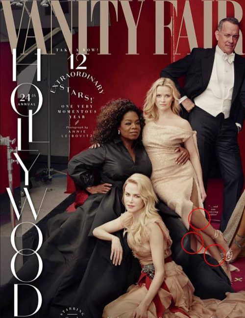 Die schönsten und mächtigsten Frauen und Männer Hollywoods zieren derzeit das Titelbild des US-Magazins „Vanity Fair“. Doch kaum jemand interessiert sich für Nicole Kidman, Oprah Winfrey und Tom Hanks (v.l.) – weltweit diskutieren und vor allem witzeln die Betrachter lieber über das dritte Bein von