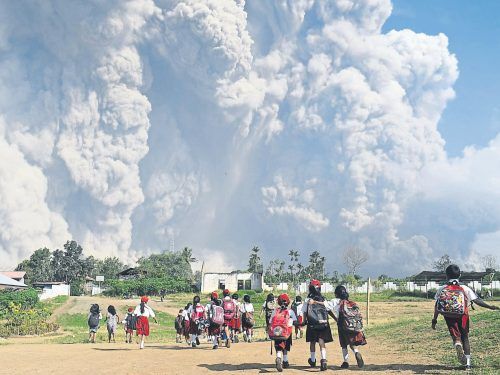 Fast fünf Kilometer ist die Aschewolke hoch, die der Vulkan Sinabung auf der Insel Sumatra in Indonesien ausgestoßen hat. Zudem traten Gase aus den Flanken des 2460 Meter hohen Massivs. Der Alltag ging trotzdem weiter, auch wenn tausende Menschen die Häuser verlassen mussten. Verletzte soll es nicht