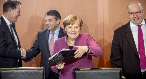 Abschied oder nicht?Die Mienen sprechen Bände. Zum letzten Mal tagt das Bundeskabinett. Gerd Müller (CSU, von links) darf Entwicklungsminister bleiben, Außenminister Sigmar Gabriel (SPD) muss akut zittern. Bundeskanzlerin Angela Merkel (CDU) packt nächste Woche die nächste Amtszeit an. Ihr enger Ver