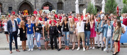 Bei Sonnenschein haben die Basketballerinnen des TSV 1880 Wasserburg gestern mit ihren Fans am Marienplatz vor dem Rathaus den Saisonabschluss gefeiert. Die Erfolge können sich sehen lassen: Die Mannschaft von Trainer Nikoly Gospodinov (links) holte den Pokalsieg und erreichte die deutsche Vize-Meis