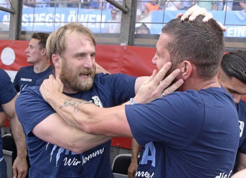 Trainer Daniel Bierofka (l.) und Torschütze Sascha Mölders umarmen sich nach vollbrachtem Aufstieg in die 3. Liga. Der Erfolg gegen den 1. FC Saarbrücken hing jedoch lange am seidenen Faden. Die Löwen lagen schon 0:2 zurück, ehe Mölders und Simon Seferings noch das 2:2 gelang (Hinspiel: 3:2). „Ich b