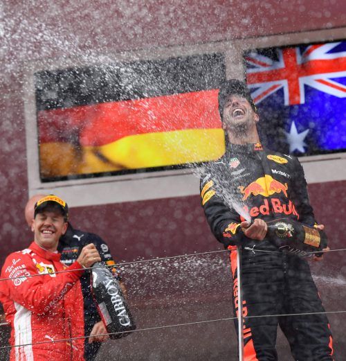 Red-Bull-Pilot Daniel Ricciardo (r.) hat erstmals in seiner Karriere das Formel-1- Rennen in Monaco gewonnen. Der Australier siegte in Monte Carlo knapp vor dem deutschen Ferrari-Piloten Sebastian Vettel (l.). Dritter wurde der Brite Lewis Hamilton – der Mercedes-Fahrer behauptete damit Platz eins i