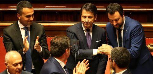 Europas SchreckgespenstDie neue Regierung in Rom ist am Ziel. Die links-rechte Koalition aus Fünf-Sterne-Bewegung und Lega hat ihren Ministerpräsidenten Giuseppe Conte (Mitte) installiert. Gestern hielt er seine Regierungserklärung. Die starken Männer aber bleiben Sterne-Chef Luigi Di Maio (li.) und