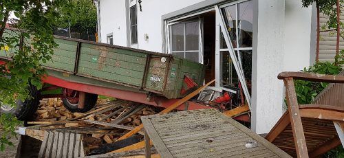 Nicht schlecht staunte eine Familie aus Höslwang (Landkreis Rosenheim) am Mittwochnachmittag, als plötzlich zwei Traktoranhänger durch die Terrassentür ins Wohnzimmer krachten. Zuvor hatten sich die Anhänger auf einem Feld, etwa 200 Meter entfernt, hinter einem Bulldog selbstständig gemacht und in R