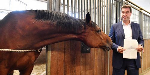 Aufs Pferd gekommenDas erste Zusammentreffen mit „Orion“ verlief noch ein wenig distanziert, aber es blieb Zeit, sich zu beschnuppern: Ministerpräsident Markus Söder (CSU) will die Polizeipräsenz zu Pferde massiv verstärken und somit das Sicherheitsgefühl der Bürger verbessern. Die Pferdestaffel der