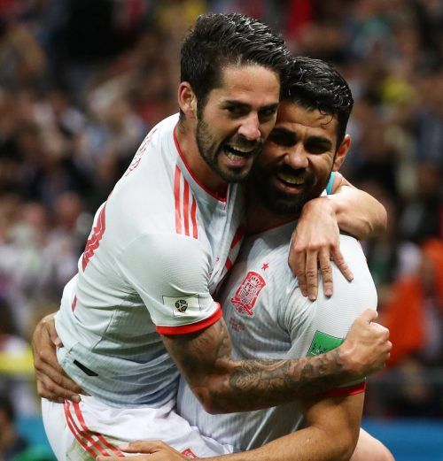Spanien hat bei der Fußball-WM im zweiten Spiel seinen ersten Sieg gefeiert. Der Mitfavorit bezwang den Iran dank eines Treffers von Diego Costa (54./im Bild rechts) mit 1:0. Zuvor hatte im anderen Spiel der Gruppe B Portugal Marokko ebenfalls mit 1:0 besiegt. In Gruppe A erreichte Uruguay durch ein