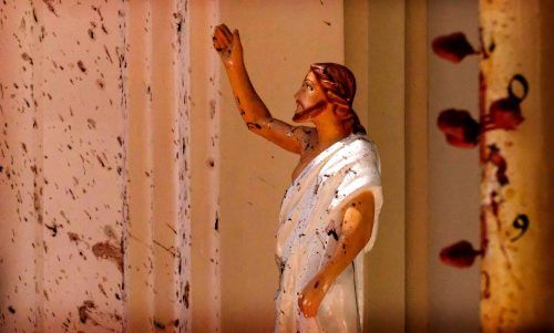 Terror an Ostern Blutflecken an der Wand und der Jesus-Christus-Figur zeugen von dem Terror, der die Menschen am Ostersonntag auf Sri Lanka traf. Das Foto stammt aus der St.-Sebastians-Kirche, einem der Anschlagsorte, an denen sieben Selbstmordattentäter Bomben zündeten. Mindestens 290 Menschen star
