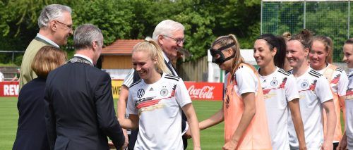 Bundespräsidenten Frank-Walter Steinmeier (Mitte) hat am Samstag zusammen mit Staatsminister Joachim Herrmann (links) und der Vizepräsidentin für Frauenfußball im Deutschen Fußballbund, Hannelore Ratzeburg, die Frauen-Fußball-Nationalmannschaft im Trainingslager in Grassau besucht. Das Team der Frau