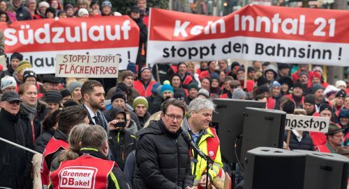 3000 Demonstranten hatten Bundesverkehrsminister Andreas Scheuer (CSU) bei seinem letzten Besuch in Rosenheim mit Trillerpfeifen und Spruchbändern empfangen (Foto: dpa), um gegen den Brenner-Nordzulauf zu demonstrieren. Heute wird er erneut in Rosenheim erwartet, wenn die Bahn ab 12.30 Uhr fünf mögl