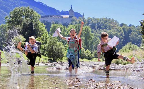 Endlich Ferien!1,7 Millionen Schüler in Bayern starten heute in die Sommerferien. Magdalena, Hannes (links) und Sebastian aus Aschau sind zufrieden mit ihrem Zeugnis – und nutzen den Heimweg für eine Abkühlung in der Prien. Mit den Fridays-for-Future-Demos soll es während der Ferien weitergehen. Fo