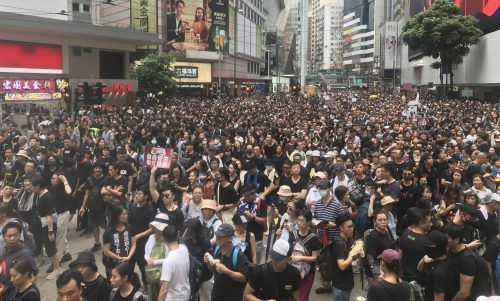 Hongkong steht auf Mehr als eine Million Menschen ließen sich gestern nicht davon abbringen, auf die Straße zu gehen – weder von Peking noch vom heftigen Regen, der kurz nach Entstehung dieses Bildes auf die Menschen nieder ging. Und die Proteste sollen weitergehen. Foto: Christoph Sator/dpa