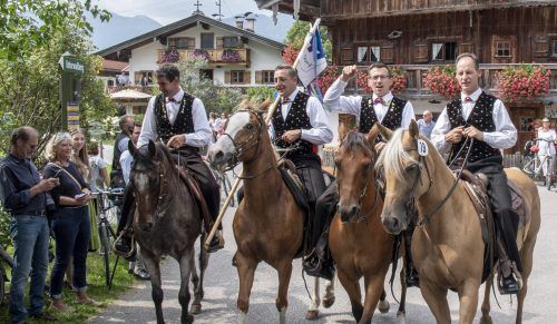 Der Rosstag in Rottach-Egern war diesmal etwas ganz Besonderes: Zum 50. Mal fand der beliebte und prachtvolle Pferde- und Kutschen-Umzug durch die Gemeinde im Tegernseer Tal statt. Auch diese vier Reiter aus der Südtiroler Partnergemeinde Kastelruth waren mit von der Partie. Foto: Thomas Plettenber