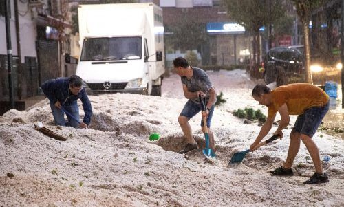 Land unter in Madrid Heftige Regenfälle mit Sturm und Hagel haben in Madrid und Umgebung Überschwemmungen verursacht. Am stärksten betroffen wurde der Ort Arganda del Rey (Foto). Hier griffen Anwohner zum Spaten, damit das Wasser durch einen Berg aus Hagelkörnern abfließen kann. Foto: epa