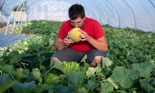 Melonen aus Bayern Geruchstest unterm Folientunnel: Johannes Dittert aus Luttenwang im Kreis Fürstenfeldbruck baut seit einigen Jahren Melonen an. Und er ist nicht der Einzige: Immer mehr bayerische Landwirte experimentieren mit dem Anbau tropischer und subtropischer Früchte. Foto: Sven Hoppe/dpa