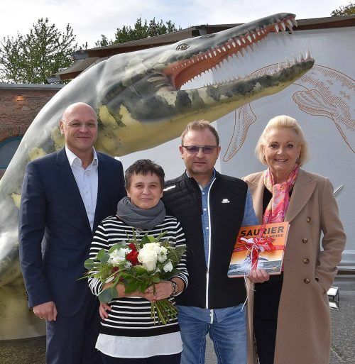 Bereits nach zwölf Tagen konnte die Ausstellung „Saurier – Giganten der Meere“, die noch bis 20. Dezember im Rosenheimer Lokschuppen zu sehen ist, ihren 15 000. Besucher begrüßen. Jubiläumsgast war Mirko Junghans (Zweiter von rechts) aus Zwickau, der sich die Ausstellung mit seiner Frau Ines (Zweite