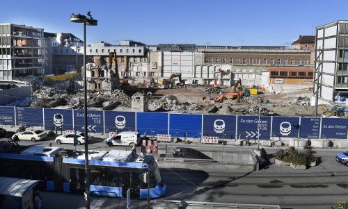 Der Hauptbahnhof in München ist nicht wiederzuerkennen: Die Abrissarbeiten der Schalterhalle sind inzwischen fast abgeschlossen, der Durchgang zu den Zügen mit Platten geschlossen (Mitte). Nur die Trambahn im Vordergrund erinnert noch an das klassische Bild des Bahnhofsplatzes mit dem legendären Sch