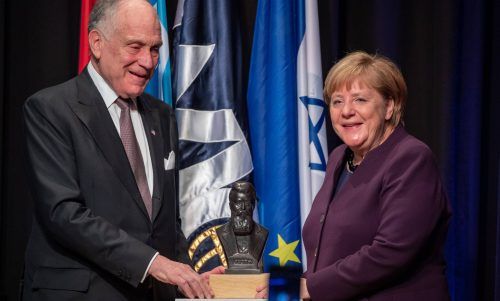 Herzl-Preis für Merkel Bundeskanzlerin Angela Merkel (CDU) ist gestern Abend in München mit dem Theodor-Herzl-Preis des Jüdischen Weltkongresses (WJC) ausgezeichnet worden. WJC-Präsident Ronald S. Lauder (links) würdigte die Kanzlerin als „Wächterin der Demokratie und der Zivilisation“. Foto: dpa