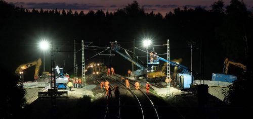 Ende 2022 soll die elf Kilometer lange Rosenheimer Westtangente fertig sein. Bis dahin sind noch einige Hürden zu nehmen, zum Beispiel an dieser komplizierten Nachtbaustelle (Foto: Kroneck) nördlich von Rosenheim bei Wernhardsberg. Dort wird die Umfahrung unter die Bahnlinie Rosenheim-München hindur