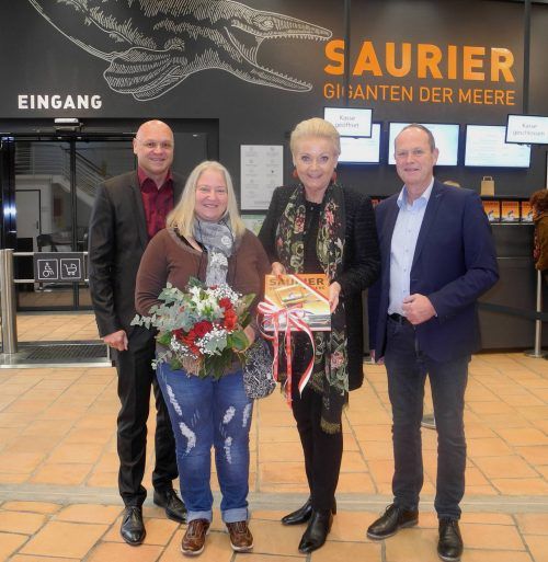 Die Ausstellung „Saurier – Giganten der Meere“ im Lokschuppen Rosenheim ist auf Erfolgskurs: Sechs Wochen nach der Eröffnung konnten die Veranstalter bereits die 50 000. Besucherin begrüßen. Jubiläumsgast war Irmgard Rottmüller (Zweite von links) aus Beyharting bei Tunten-hausen. Die Hauswirtschafte