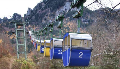 Farbenfroh fast wie auf einer Perlenkette aufgereiht –präsentierten sich gestern für die Revisionsarbeiten die Kabinen der Kampenwandseilbahn in Aschau (Foto: H. Reiter). Auch während der Arbeiten können Ausflügler am 1. Dezember und bei schönem Wetter immer samstags per Seilbahn den Aschauer Hausbe