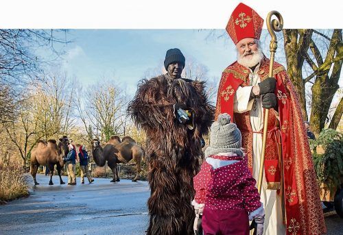 Der Nikolaus kommtDer Nikolaus und der Krampus sind für sich schon schwer beeindruckend. Heute und morgen klopfen die beiden wieder an viele Türen. Die Kamele im Hintergrund gibt’s aber nur, wenn man – wie dieses Kind – mit dem Nikolaus den Tierpark Hellabrunn besucht. Foto: jörg Koch