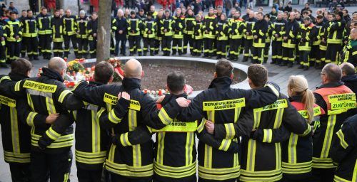 Augsburg trauert Beim Streit mit einer Gruppe Jugendlicher ist am Freitagabend in Augsburg ein Feuerwehrmann getötet worden. Seine Kollegen trauerten am Sonntag am Königsplatz um den 49-Jährigen. Weniger als 48 Stunden nach dem Angriff hat die Polizei sechs Personen, darunter die Hauptverdächtigen,