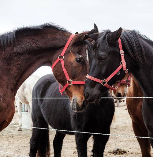 Polizeipferd Vulkan (links), das nach 17 Jahren aus dem aktiven Dienst ausgeschieden ist, hat ein neues Zuhause gefunden: Das Pferd darf nun auf Gut Aiderbichl in Henndorf bei Salzburg seinen Ruhestand genießen und hat bereits Freundschaft mit Pferd Carino (rechts) geschlossen. Vulkan stand seit 200