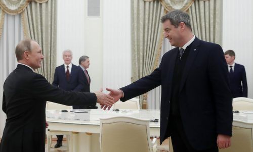 Ein heikler Händedruck Für Markus Söder ist es wohl die heikelste Reise seiner bisherigen Amtszeit als Ministerpräsident: In Moskau empfängt ihn Kreml-Chef Wladimir Putin zum gut halbstündigen Gespräch. Söder bleibt in der Frage der Wirtschaftssanktionen indes demonstrativ hart. Foto: dpa